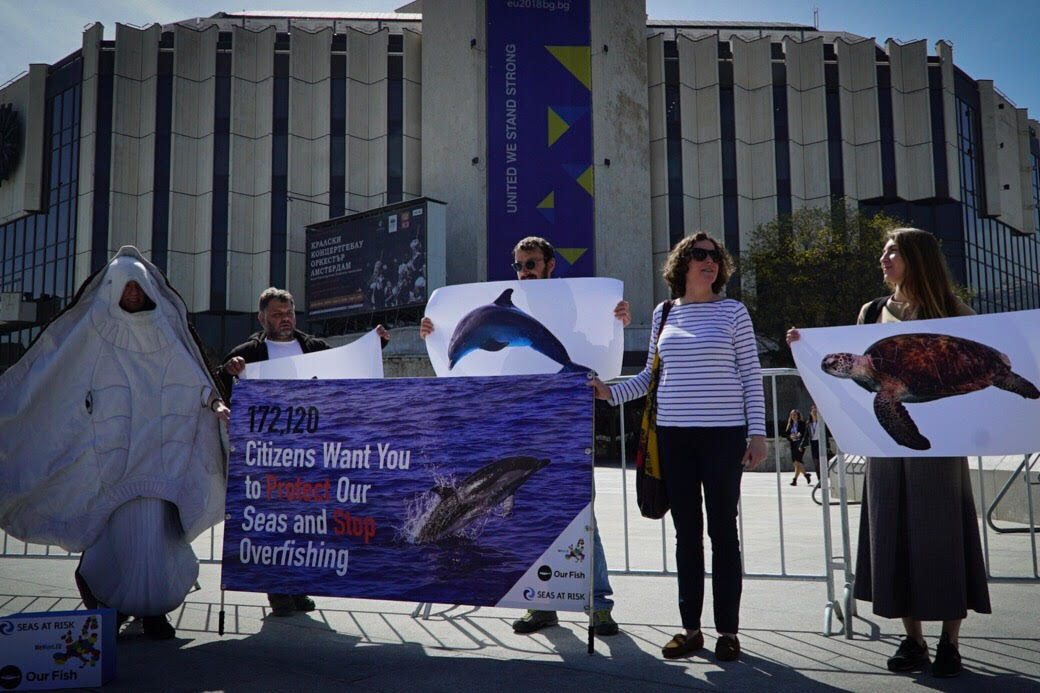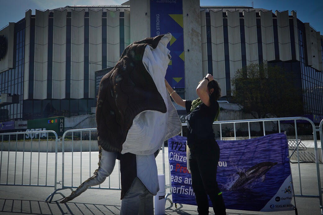 На влизане в НДК екоминистрите от ЕС бяха посрещнати от демонстрация за спасяване на моретата.