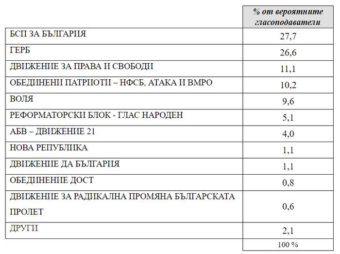 Както и в проучванията досега, ГЕРБ и БСП са рамо до рамо в надпреварата за първото място, като в момента левицата води с 1,1% - тоест символичната преднина е изцяло в рамките на статистическата грешка.