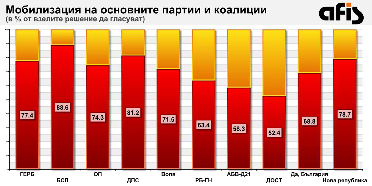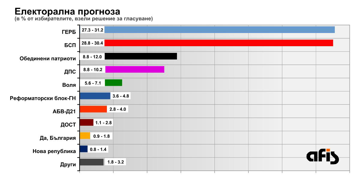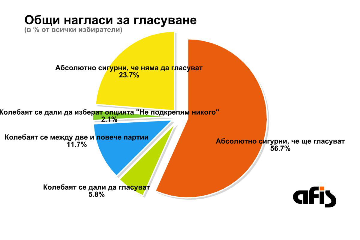 Дни преди изборите в четвъртък отговорът на въпроса кой ще е победителят е все така неясен. С равни възможности да се класират на първо място са двете водещи партии БСП и ГЕРБ, като БСП има предимство сред твърдо решените да гласуват, а ГЕРБ все още разполага с резерви за разширяване на електоралната си база сред колебаещите се избиратели. Интригата ще се разреши от сравнително малка, но постоянно намаляваща група избиратели (към момента нейният дял възлиза на около 12%), които в анкетна среда декларират, че е възможно да вземат окончателното си решение в последния момент. Това сочат данните от последното национално проучване на агенция "Афис".