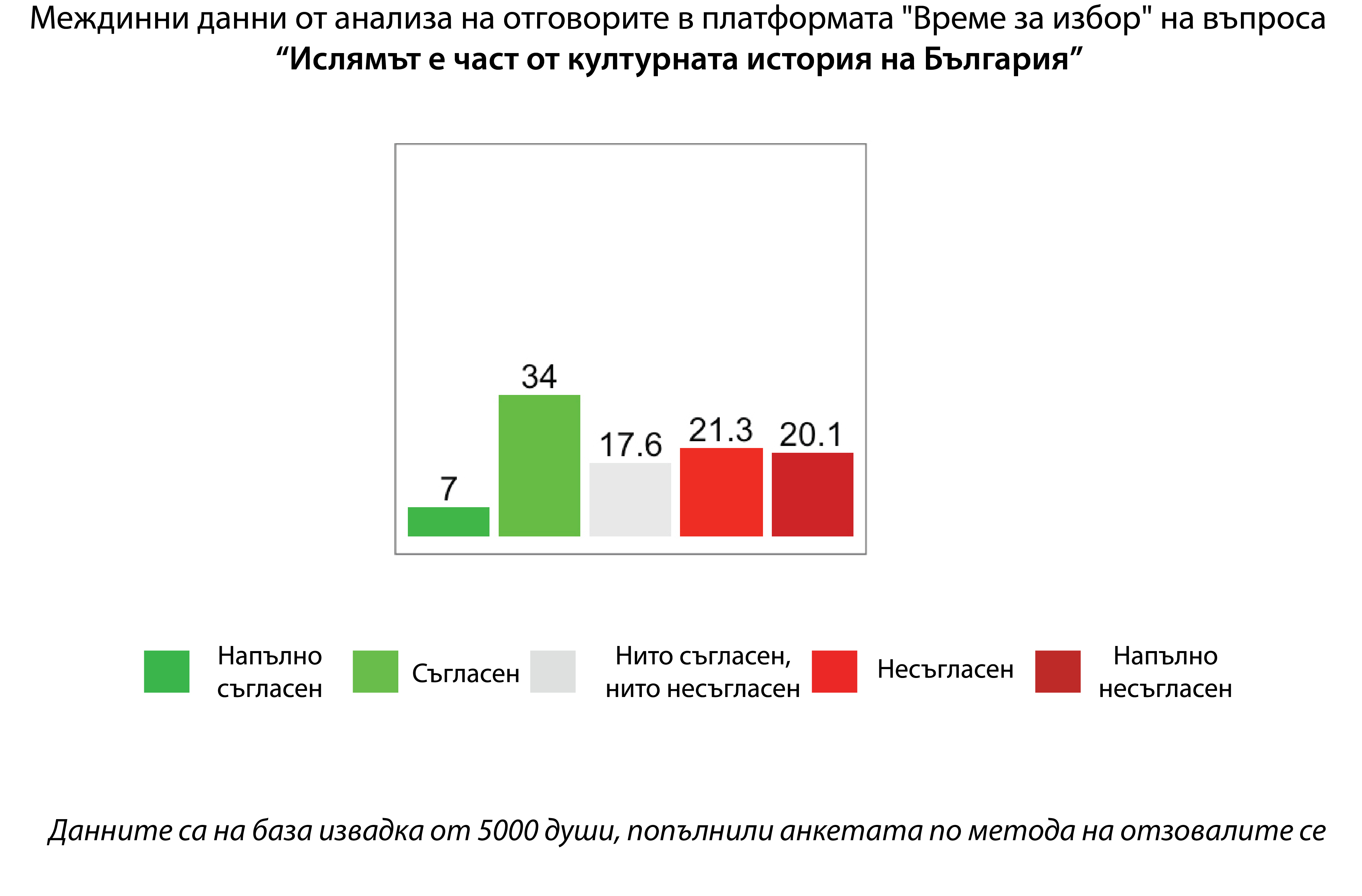 Любопитен е и анализът на данните по твърдението "Ислямът е част от културната история на България". 42% от потребителите на платформата мислят, че твърдението не е вярно. Приблизително същият брой участници във въпросника отговарят обратното, а неутралните са 17 на сто от участниците.