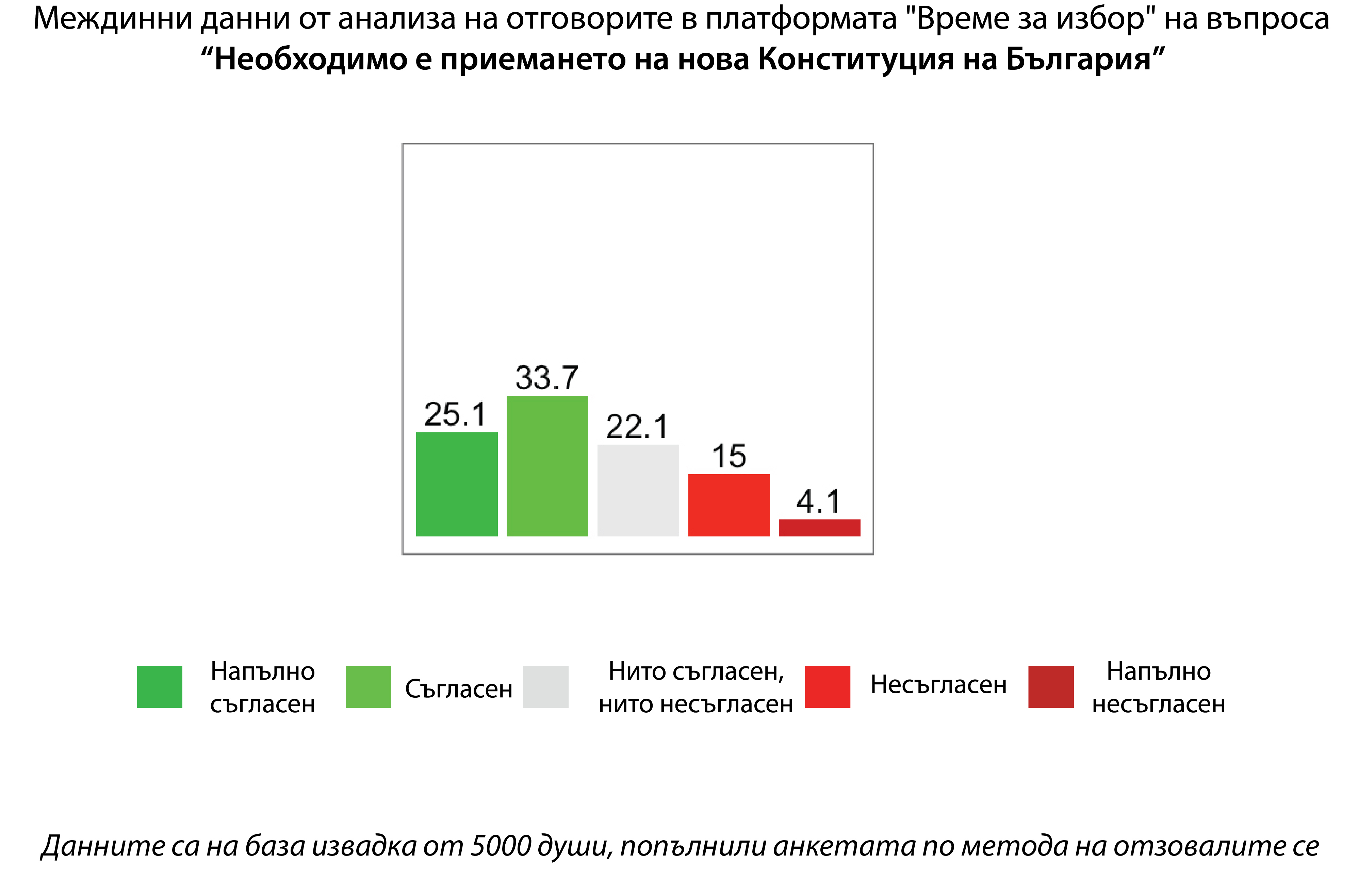 Твърдението, че трябва да се приеме нова конституция - тема, която се търкаля преди всички избори от години в комплект с предизвикването на вот за Велико народно събрание, без което нов основен закон е невъзможен, се споделя напълно от 25,1% от отговорилите на въпроса в платформата. Съгласни са още 33,7% от гражданите, попълнили теста. Сред общо 20-те твърдения, на които трябва да отговорят потребителите на "Време за избор" обаче, този за нова конституция събира внушителен "неутрален" вот - над 22 на сто. Други общо близо 20% от потребителите не са съгласни, че настоящата конституция трябва да бъде сменена.