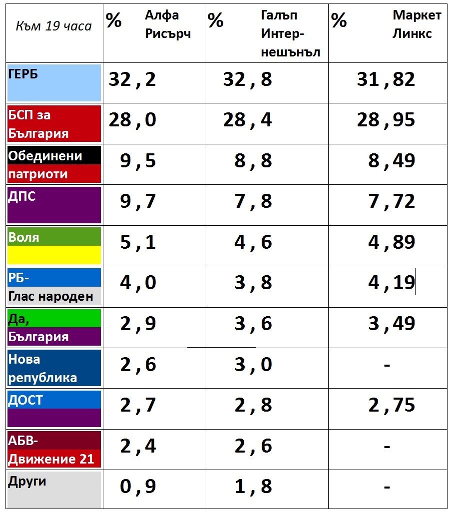 Реформаторският блок е на ръба - според "Алфа рисърч" с 4% и 3,8 на сто при "Галъп". Шансовете си не са изгубили и "Да, България" с 3,6%, според екзит пола на "Галъп интернешънъл". "АБВ - Движение 21", ДОСТ и "Нова република" остават извън парламента.