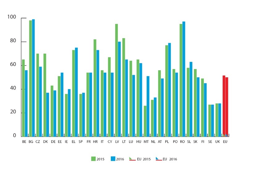 Тази графика показва показателите за всички страни от ЕС за 2015 и 2016 г. Докато повечето страни вървят надолу, България за съжаление върви нагоре.