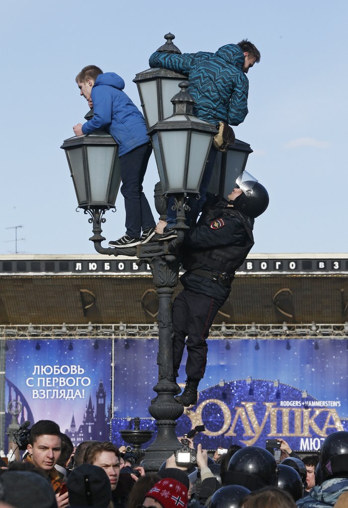 В разгара на протеста в Москва в неделя срещу това, което организаторите наричат официална корупция, 17-годишният Шингаркин и още един младеж се покатериха на улична лампа на Пушкинския площад.