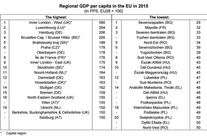 Сред петте на върха прави впечатление, че освен традиционни като Люксембург има и един от бившия соц.лагер - Братиславският регион в Словакия. Там са 188 % по-богати от средното за Европа.