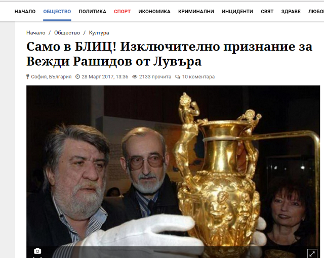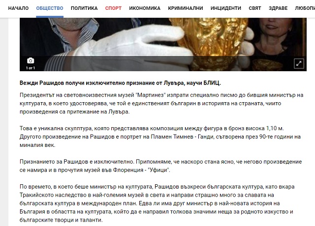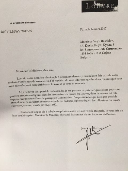 Всъщност обаче от "Площад Славейков" (където очевидно някой знае френски, б.р.) уточняват, че от приложеното писмо се разбира, че произведения на бившия ни министър на културата действително са пристигнали в Лувъра... И съвпаденията свършват дотук. Мартинез изразява благодарността си с други думи, а пратеното от Рашидов е наречено „дипломатически подаръци“.