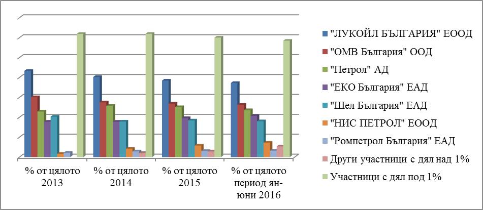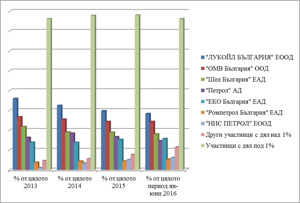 В документа обаче има таблици на дяловете на големите вериги в продажбите на бензин и дизел. Конкретните стойности са заличени, но графиката може да ориентира.