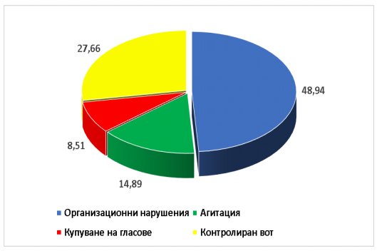 Както се вижда на диаграмата, мнозинството сигнали всъщност са за организационни нарушения - почти половината. Необичаен обаче е фактът, че обикновено този тип сигнали са 60-70% от подадените. Според доклада на организацията донякъде намаляването на този тип нарушения е заради факта, че сега имаше само избори за Народно събрание, а предишните два вота - местните през 2015 г и президентския през 2016 г - се проведоха едновременно с национален референдум.