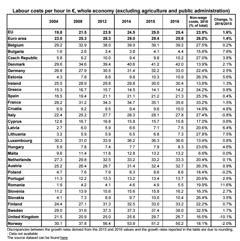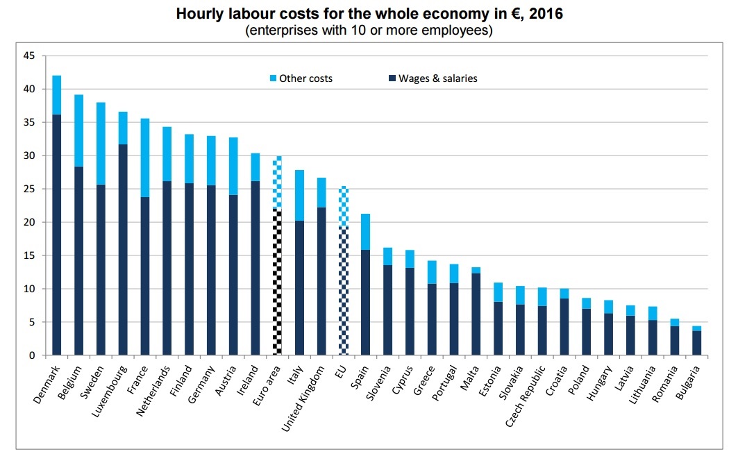 Данните са за предприятия с над 10 служители. В цената на труда са включени заплати и социални осигуровки.