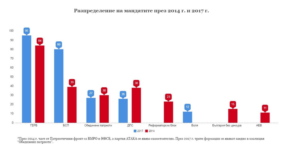 В случая на ГЕРБ, които са вложили три пъти повече средства в медийното си отразяване през тази година, увеличението на броя на мандатите не е правопропорционално – през 2014 г. те са имали 84 депутатски места, докато сега те са 95.