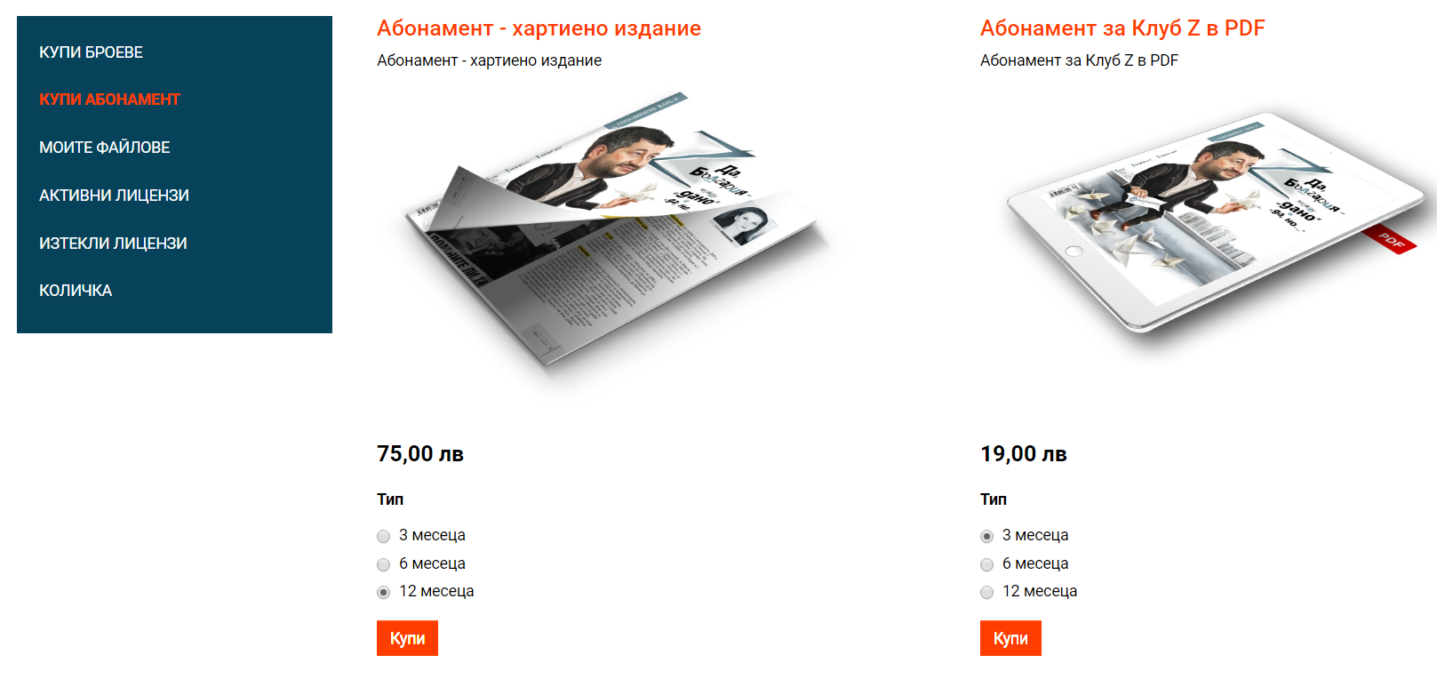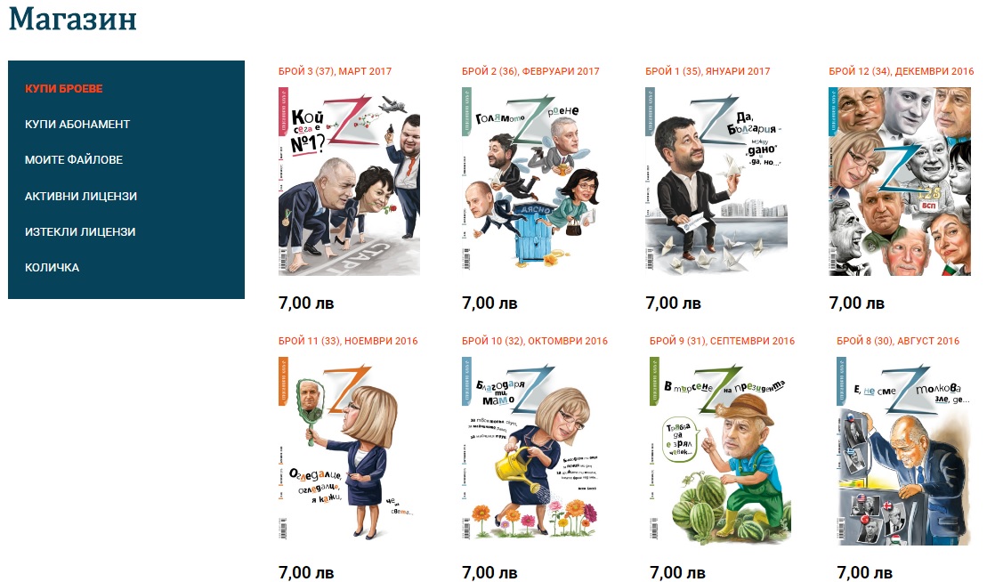 В сайта ни вече работи удобен магазин, чрез който списание „Клуб Z” ще стига до читателите само за няколко минути (при това по-евтино), ако си го поръчат в електронен вариант на PDF, и за два-три дни (работни), ако са традиционалисти и искат „да пипнат“ хартиеното издание.