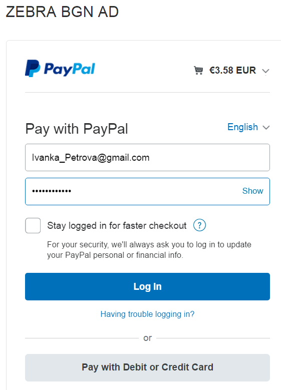5. Платете с дебитна или кредитна карта, като използвате профила си в Pay Pal. Ако нямате такъв, не се притеснявайте – създаването му отнема буквално секунди, като е достатъчно да следвате инструкциите.