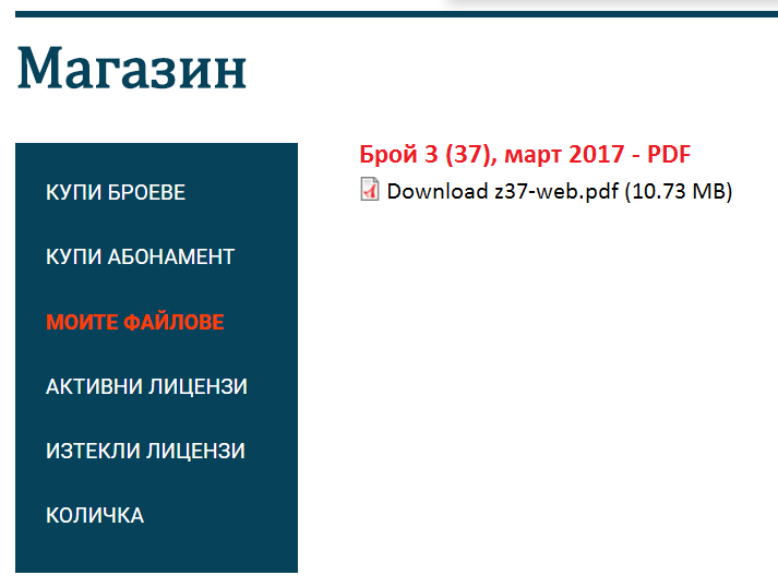 6. Прочетете броя на списание „Клуб Z”, който току-що си купихте. Ако сте платили електронния вариант (PDF), разбира се. Натиснете отново бутона „Магазин“ и изберете опцията „Моите файлове“, за да изтеглите списанието:
