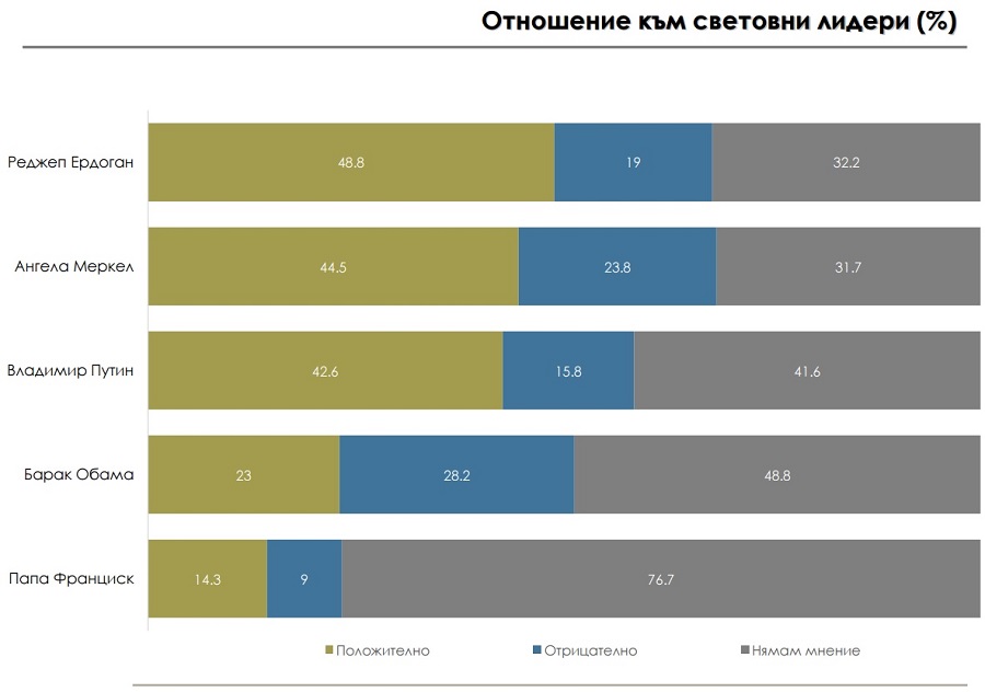 Президентът на Турция е най-одобряваният световен лидер за българските мюсюлмани. Той е преди Ангела Меркел, Владимир Путин и Барак Обама. (изследването е правено през септември 2016 г.)