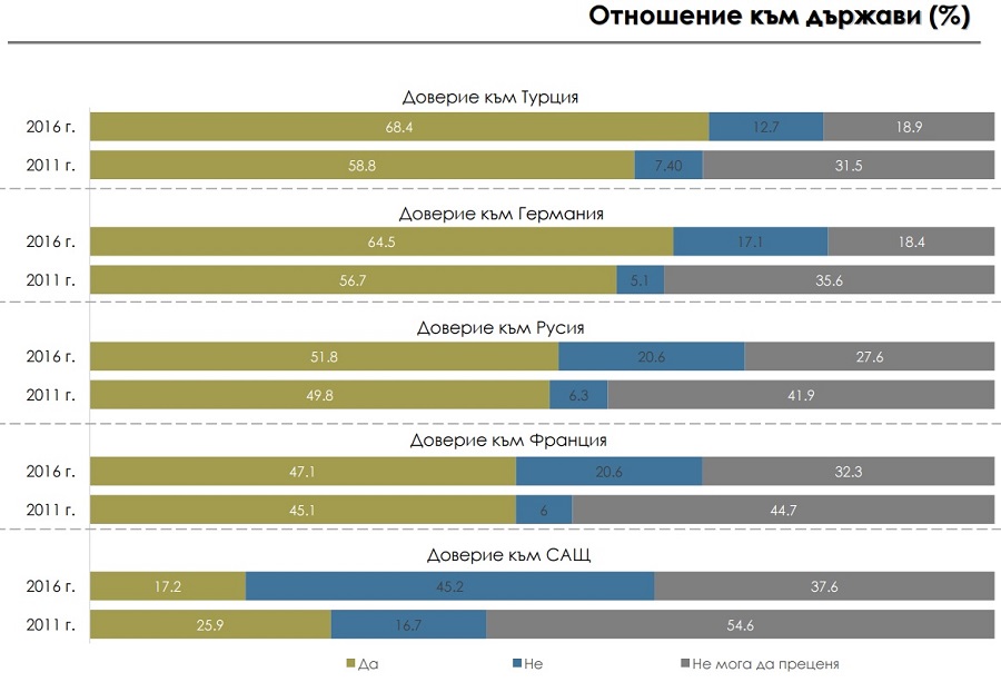Турция е държавата с най-високо доверие за българските мюсюлмани. И това доверие дори нараства през последните пет години. От 58 на 68%. Чак след това са Германия, Русия, Франция и САЩ.