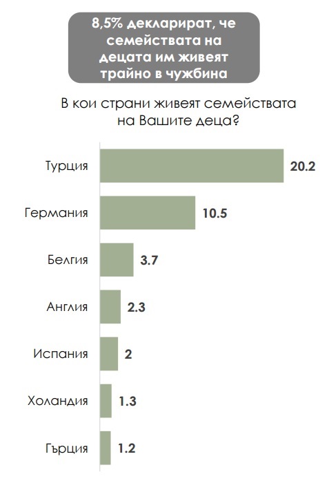Почти няма турци в България, които да нямат роднини в Турция. Изследването обаче поставя въпроса къде живеят семействата на вашите деца. На 8,5% от мюсюлманите в България децата им живеят трайно в чужбина. От тях над 20% са в Турция.