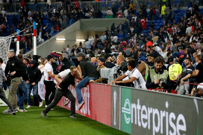Започнаха да хвърлят бомбички и димки, а също така сигнални ракети (интересно как са ги вкарали на стадиона) по феновете на французите. Съответно те не издържаха на провокациите и хиляди излязоха на терена. Някои за да избегнат пиротехническите средства, други, за да атакуват секторите, в които имаше най-много турци.