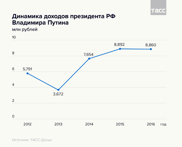 Доходите на самия президент Владимир Путин са много по-скромни от тези на неговите приближени, поне в декларацията. И през миналата година са намалели с 33 000 рубли спрямо 2015-а до 8,86 милиона рубли (близо 148 000 евро).