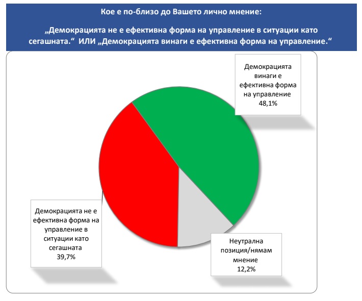 Въпреки това обичайната позитивна нагласа към Европа не е намаляла. Според 64% от анкетираните подобни ситуации сочат, че ЕС ни е нужен. Притеснително, но не необичайно е това, че 39,7 на сто смятат демокрацията за неефективна форма на управление в подобни кризисни ситуации. На обратното мнение са 48,1% от анкетираните, а 12,2% нямат мнение.