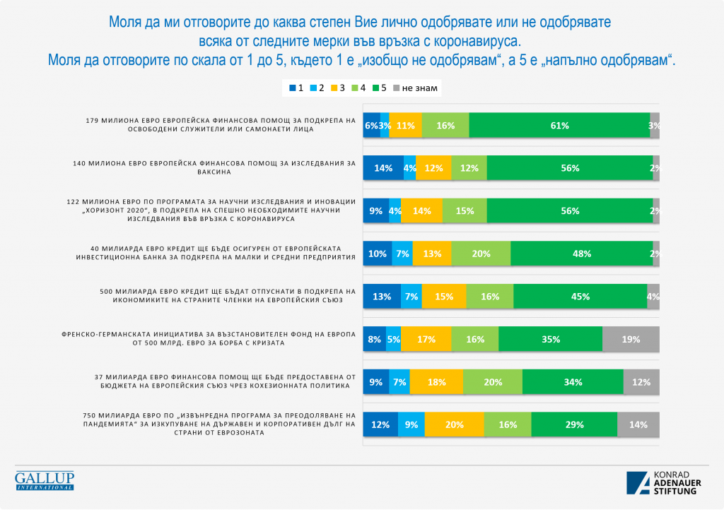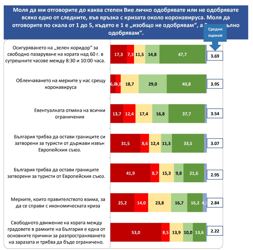 Показателен е фактът, че мнозинството анкетирани одобряват европейската финансова помощ за подкрепа на освободените служители или самонаети лица и за изследвания за ваксина. Вътрешните мерки не са толкова популярни, като най-одобряван е т.нар. "зелен коридор" за свободно пазаруване на хората над 60 г. в сутрешните часове и затварянето на граници за туристи от държави извън ЕС. Голям дял одобряват облекчаването на мерките срещу пандемията, много - и пълното им премахване.