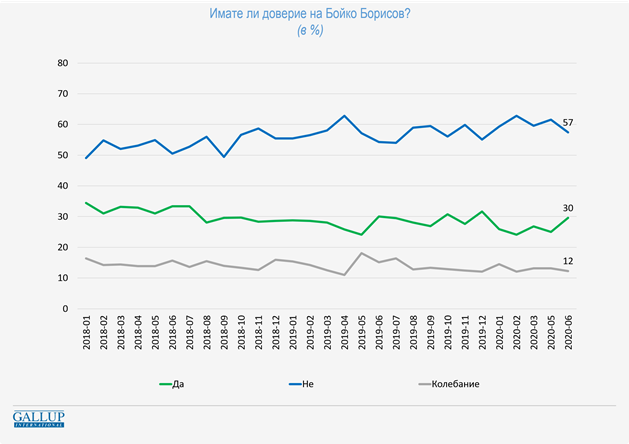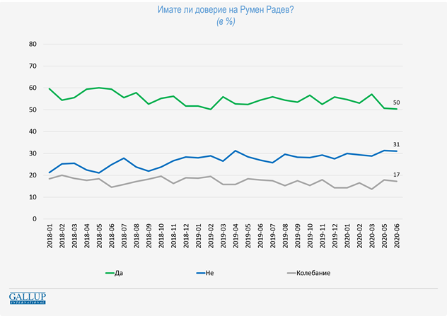 Доверие към президента Румен Радев в началото на юни декларират 50%. 31% са на противоположна позиция, 17% се колебаят. 30% заявяват одобрението си към Бойко Борисов, 57% - са на обратното мнение. 12% се колебаят.