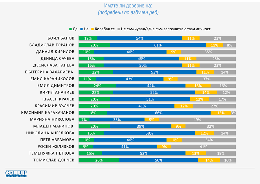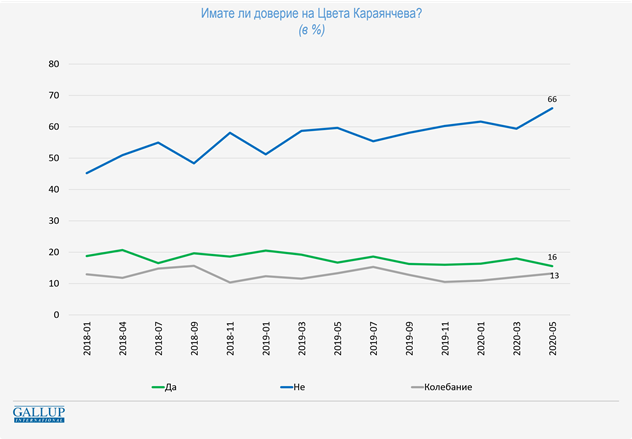 В края на май 16% от пълнолетните българи заявяват доверие в Цвета Караянчева, председател на Народното събрание, а 66% - недоверие. 13% се колебаят, а 5% все още не са запознати с нея. Трябва да се отбележи, уточняват от "Галъп интернешънъл", че доверието в председателя на Народното събрание се измерва на всеки два месеца, респ. последните данни са от края на май и няма как да отразят евентуално влияние на спрягането на името на Караянчева по повод записи.