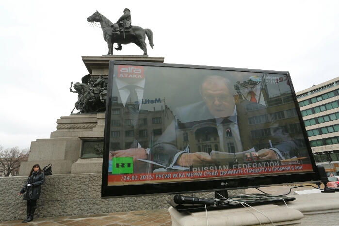 Протестиращите подгряваха с руския англоезичен канал "Russia Today", по който наблюдаваха изявление на министъра на външните работи на Руската федерация Сергей Лавров.