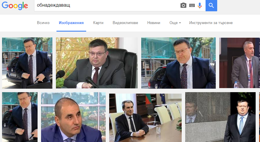 Напишете в Google "обнадеждаващ", после изображения (или images) и вижте кои са най-първите резултати от търсенето ви. Насреща грейва образът на главния прокурор Сотир Цацаров в различни варианти, после следва Лукарски, пак Цацаров, Цветан Цветанов, Орешарски и пак Цацаров. Вече по-надолу се появяват и други възможности. Така според търсачката изглежда "обнадеждаващ".