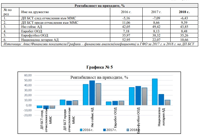 Финансите на тотото винаги са били "тъмна Индия". Когато се заговори, че може да стане спонсор на "Левски", проверка на Клуб Z показа, че е съмнително с какви точно средства може да случи това именно защото дружеството работи на загуба. Това се затвърждава и от доклада на палатата. "Предприятието ежегодно отчита отрицателен финансов резултат (загуба) за периода от 2014 до 2018 г. включително. Налице е тенденция на постоянно намаление на собствения му капитал, която се наблюдава и след одитирания период", отчитат одиторите. Те констатират също така, че "правната рамка не осигурява равни пазарни условия за осъществяване на дейността на ДП БСТ, адекватни на тези, при които оперират частните конкуренти на предприятието". Но пък причината е в това, че тотото като публично предприятие има за цел да събира средства за спорт, а функциите му, вменени със закон, "ограничават пазарния му потенциал".