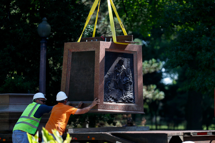 От телевизионни кадри се вижда как работници свалят с кран статуята на Колумб от пиедестала й в Тауър Гроув парк и я товарят на камион. Не бе съобщено къде ще бъде откарана скулптурата.