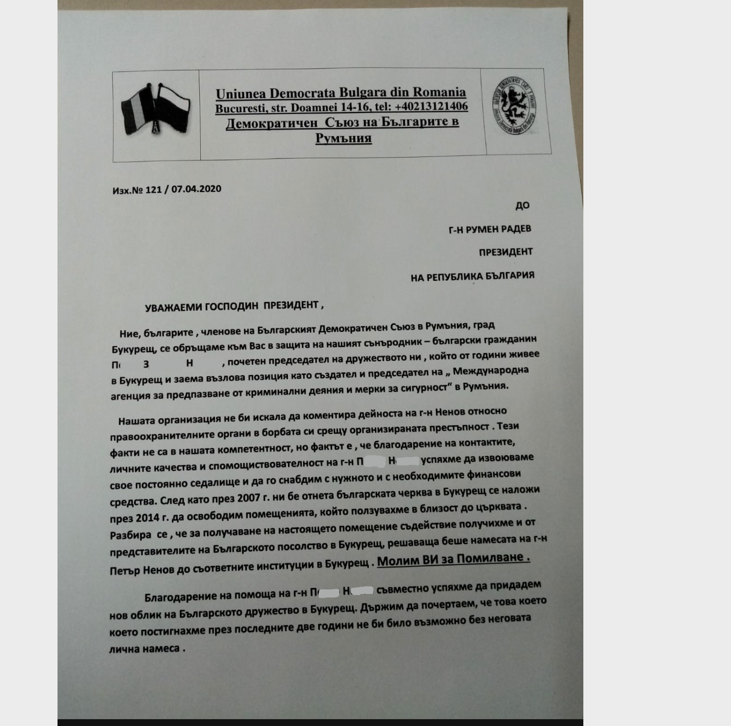 На 7 април т.г. Pepi-Ro изпраща на П. Б. снимка на писмо, адресирано до президента на Република България от Демократичен съюз на българите в Румъния, в което се иска помилване на българския гражданин П. З. Н. На 16 април т.г. Pepi-Ro изпраща на П. Б. информация, отнасяща се до неговото пребиваване и осъждане в Румъния, вкл. направени от него дарения.