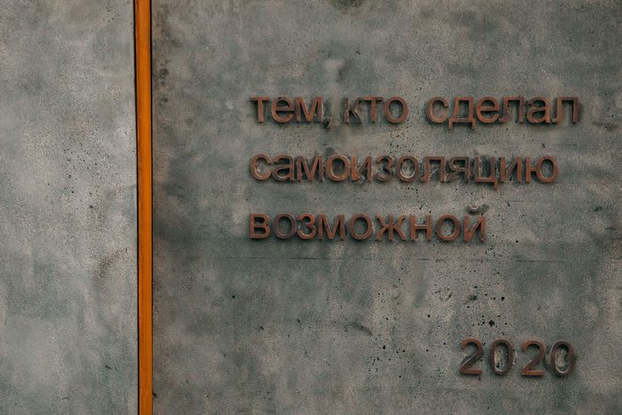 Инсталацията, проектирана от художника Алексей Гарикович, е висока около три метра и представлява дебел лист ръждив метал, в който е изрязан силуетът на изправен човек. Монументът е изработен от метала и бетон - тези материали традиционно се свързват с градската среда и урбанистичния стил, поясниха от веригата супермаркети "Азбука вкуса" (Азбука на вкуса). На тези, които направиха самоизолацията възможна", е изписано на паметната табелка.
