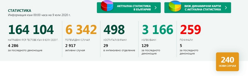 Към 9 юли в България вече са регистрирани общо 6342 случая на коронавирусна инфекция, 259 от тях са завършили фатално. Общо излекуваните са 3166.