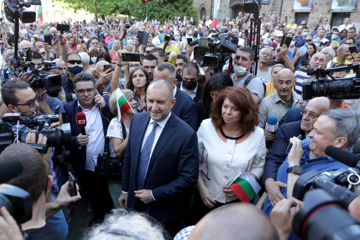 В 18,30 часа Румен Радев и вицепрезидентът Илияна Йотова слязоха сред събралите се, а държавният глава призова: "Мутри вън!"