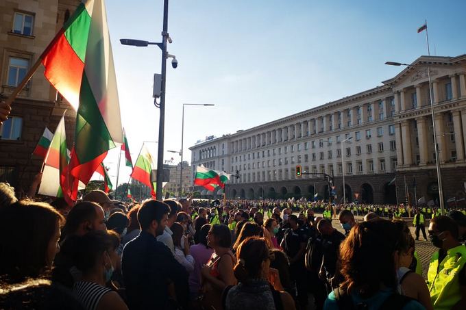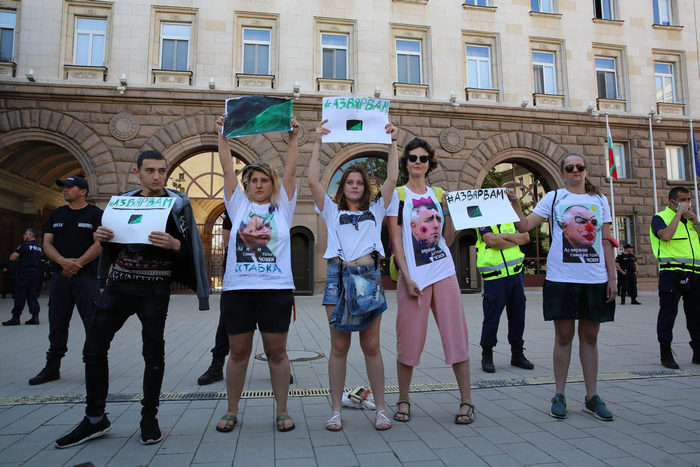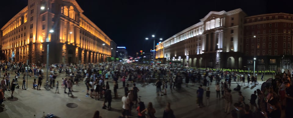 19:00 часа. Цвета Караянчева и министри говорят пред сградата на Министерския съвет отсреща. Най-честите скандирания са: