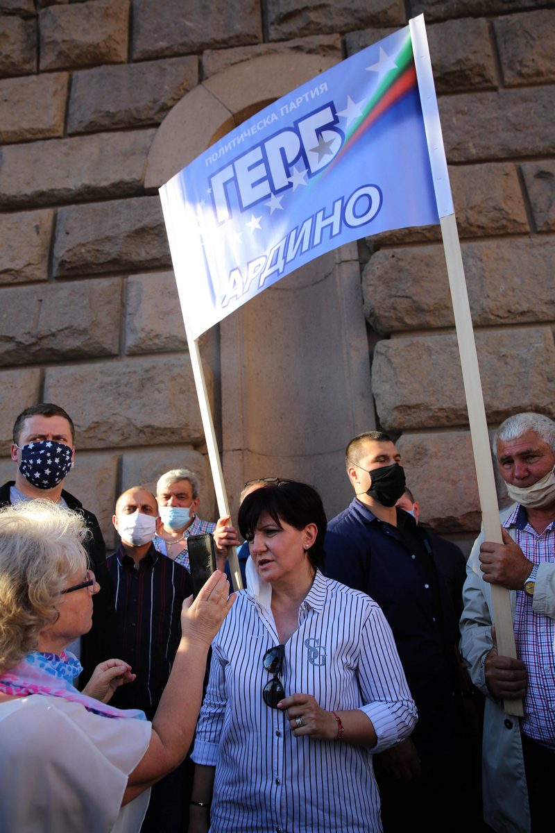 В същото време пред Министерския съвет вече започна протест в защита на правителството. На място пристихнаха и видни представители на управляващите, начело с председателката на Народното събрание Цвета Караянчева. Тя обяви, че това не е контрапротест, а мигинг в защита на европейския път на България. И заяви как целта на държавния глава била да падне кабинетът, да има служебно правителство и да оттегли кандидатурата на България за механизма ERM-2.