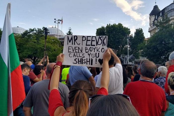 Единият бе футболна врата с призив "Бий му дузпата" и електрически стол с карикатура на премиера Бойко Борисов и думите "Бургас ви обича", донесен явно от симпатизанти от морския град. Тази вечер в т.нар. Триъгълник на властта можеха да се забележат хора от други градове на страната, а не само софиянци.