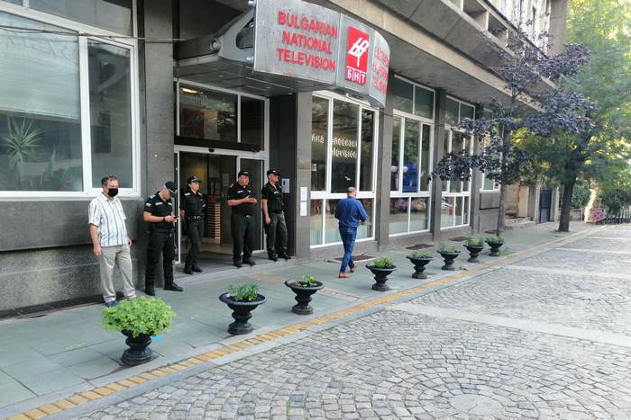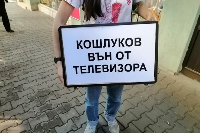Паралелно с протеста на Ларгото 200 души се събраха около 18,30 часа тази вечер пред сградата на БНТ с искане за оставката на генералния директор Емил Кошлуков.
