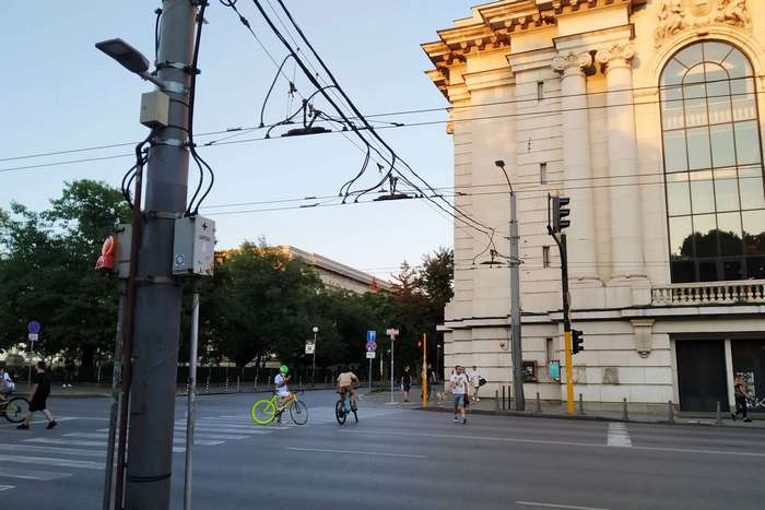 Към 20:30 вечерта кръстовището пред Софийския университет и "жълтите павета" се превърнаха в "пешеходна зона" и удобна велоалея.