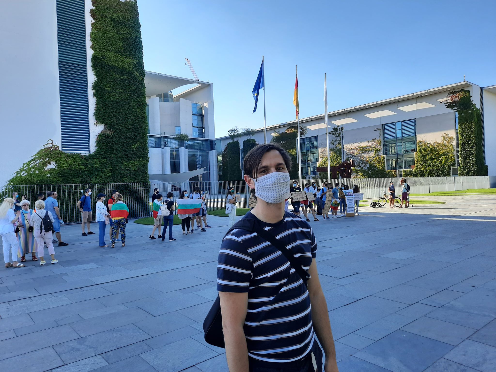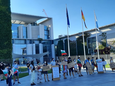 Близо 20 души, предимно студенти, се събраха днес пред канцлерството в Берлин, за да изразят подкрепата си с протестите в България и да поискат да се спре подкрепата за корумпираните управляващи.