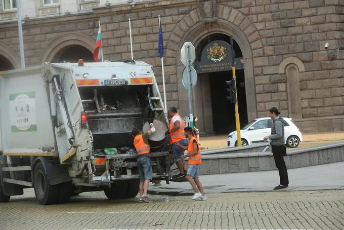 На жълтите павета - в т. нар. Триъгълник на властта, граждани на служба в "Титан" почистват остатъците от боклуците: