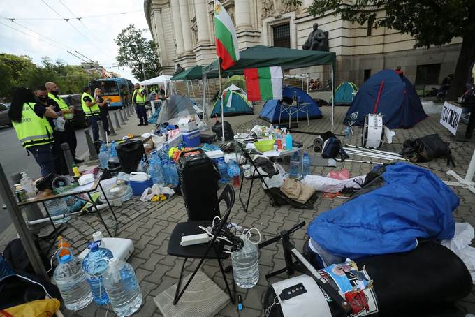 На кръстовището пред Софийския университет атрактивна полицайка прави оглед на остатъците след лагера на майките от "Системата ни убива".