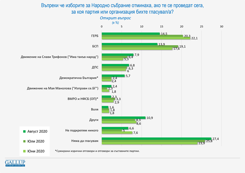 В открит въпрос ГЕРБ взема 14,5%, или около 800 хиляди потенциални гласове (от общо около 5.5 млн. трайно пребиваващи с избирателни права у нас). БСП е с 13,9%, което значи малко под 800 хиляди гласа. На последните парламентарни избори ГЕРБ събра около 1150 хил. гласа, а БСП – около 950 хиляди. ГЕРБ има преднина и сред твърдо решилите да гласуват.