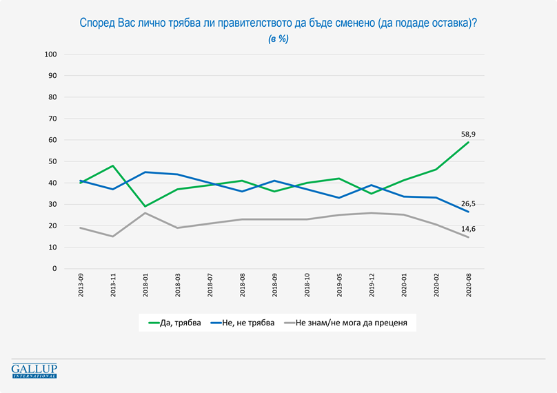 62% от анкетираните казват, че подкрепят протестите срещу правителството. 23,7% са на обратната позиция, а останалите се колебаят. 58,9% искат оставка, а 26,5% са на противоположното мнение. Данните показват и обичайната от десетилетия структура на мненията по всички въпроси за властта у нас в края на всеки един мандат, но в същото време сочат и сериозно обществено раздразнение. Свидетелство за последното е, че вече 50% смятат, че предсрочните избори са необходими за страната, докато 34,1% са на обратното мнение. Останалите се колебаят.