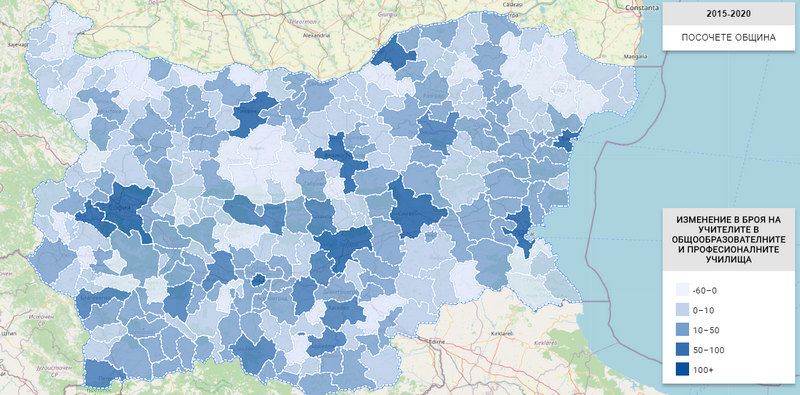 В страната като цяло тенденцията е откровено положителна – според данните на НСИ, в рамките на пет години общият брой на учителите в общообразователните и специалните училища е нараснал с над 7 хиляди души, до общо 50,4 хиляди. В 54 общини обаче броят на учителите намалява или остава същият. На регионалната карта отчетливо се открояват зони с отлив на преподавателите – край Добрич, Ловеч и Видин, но и в отделни по-малки и планински общини в Южна България. Очаквано, най-големите общини, където са разположени и водещите училища в страната, най-бързо добавят нови преподаватели – само в София те са над 2 хиляди, във Варна – 444, в Пловдив – 393.