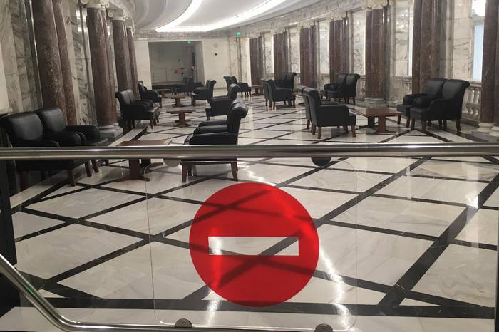 Покрай тази зала са стълбите, които отвеждат до т.нар кошари – местата за операторите и фотографите в самата пленарна зала. Минава се покрай мястото за отдих на народните представители, което все е празно, но за сметка на това са поставени турникети, така щото достъп да имат само те и администрацията на Народното събрание.