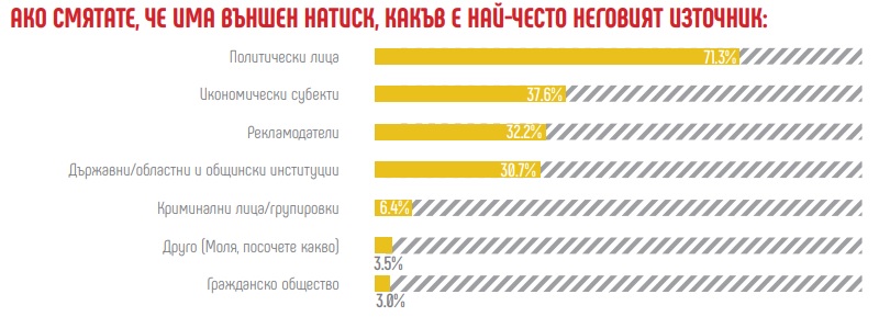 Този извод се потвърждава и от значителния ръст на външните форми на натиск. Ако през 2017 г. ,,външният натиск“ е оценен на 59%, а ,,вътрешният“ е посочен от около 65% от респондентите, то три години по-късно има отново видим обрат. ,,Външният натиск“ върху редакциите става все подоминираща форма за намеса в редакционното съдържание.
