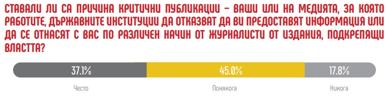 „Наблюдава се притеснителна тенденция държавни институции да отказват да предоставят информация или да демонстрират различно, пренебрежително или арогантно отношение към критични медии. Над 80% от анкетираните журналисти заявяват, че са били обект на подобно отношение ,,често“ или ,,понякога“, отчитат от асоциацията.