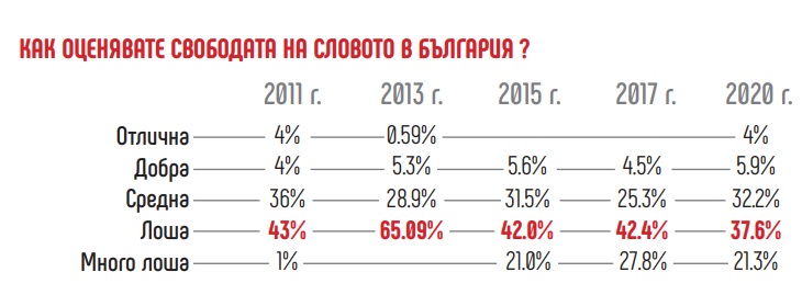 Външен натиск от политически лица върху медиите – в пъти по-голям от този, който оказват икономически субекти, рекламодатели, държавни и общински институции. Автоцензура, която се превръща в неписана норма. Пренебрежително и арогантно отношение от страна на институциите към критични медии. Почти всеки втори български журналист дава оценки ,"лоша" и "много лоша" за медийната среда в България през тази година, а ,"отлична" - едва 3%. Пандемията от COVID-19 рефлектира негативно и върху редакциите.