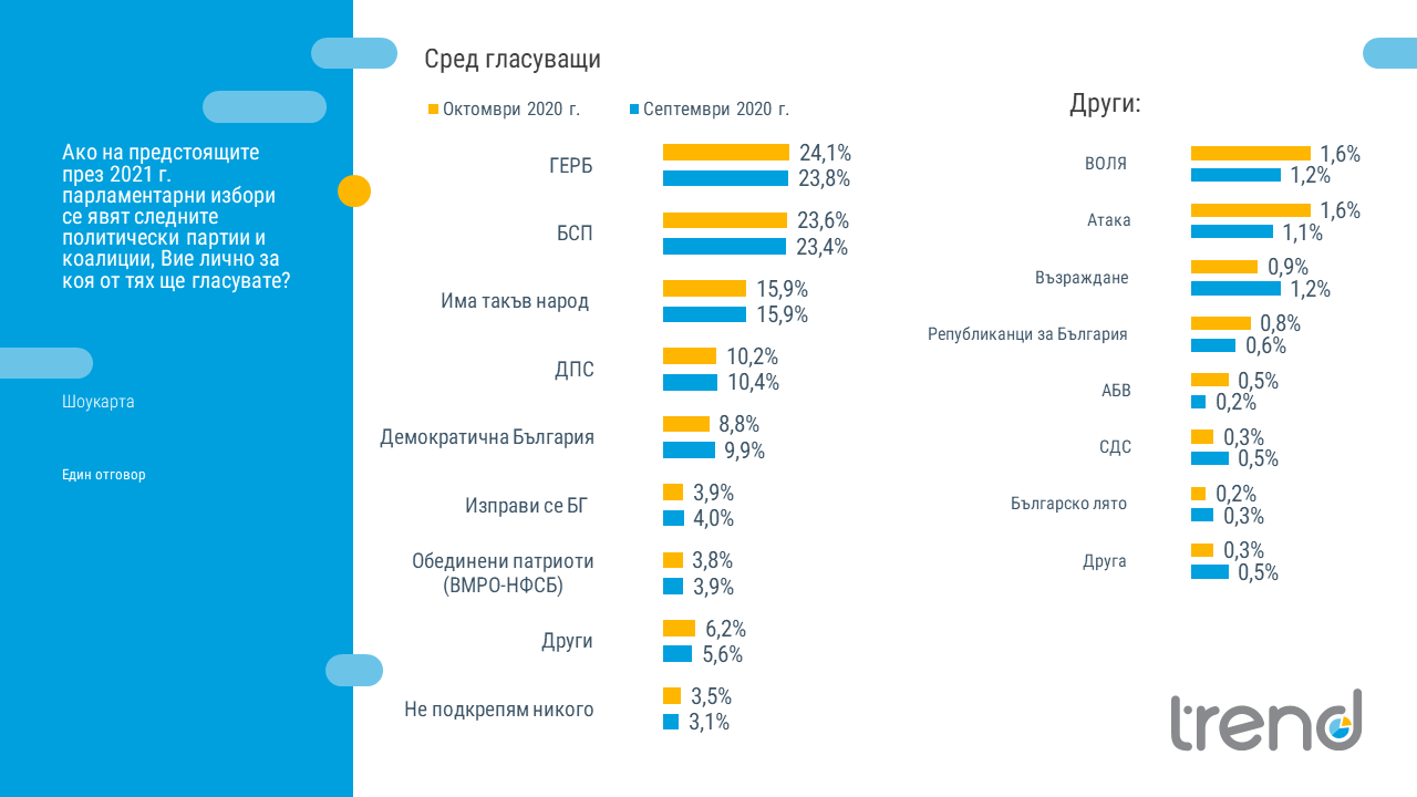 След два последователни месеца на динамика в електоралните нагласи през октомври има стабилизация в данните за електоралните нагласи на нивата от септември. ГЕРБ и БСП остават в практически паритет. Моментната снимка сочи сигурни пет партии в следващото Народно събрание, като освен ГЕРБ (24,1%) и социалистите (23,6%), в парламента влизат партията на Трифонов с 15,9 на сто, ДПС (10,2%) и "Демократична България" (8,8%). С реални шансове за представителство остават и формацията около Мая Манолова (3,9%) и "Обединени патриоти" (ВМРО и НФСБ) с 3,8%. Сред по-малките политически формации също не се наблюдава съществена динамика. Разликите са в рамките на стандартното статистическо отклонение.